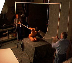 Morey adjusts the model's hair and rope prior to shooting. |